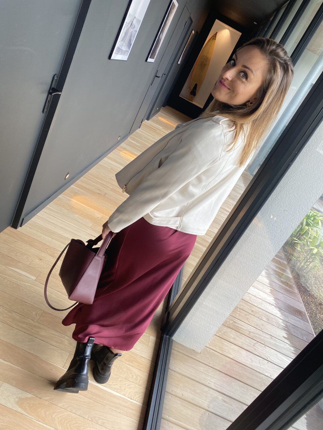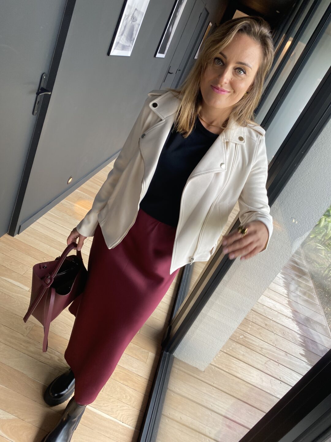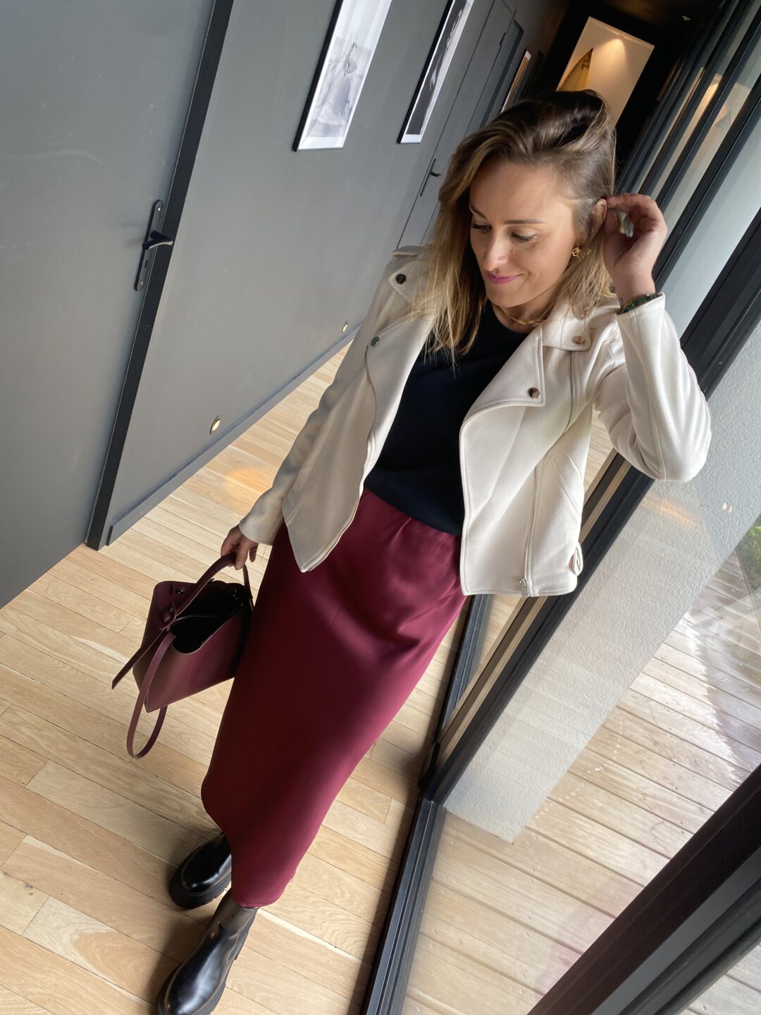 Jolie jupe tendance, tissu effet satin, couleur bordeau