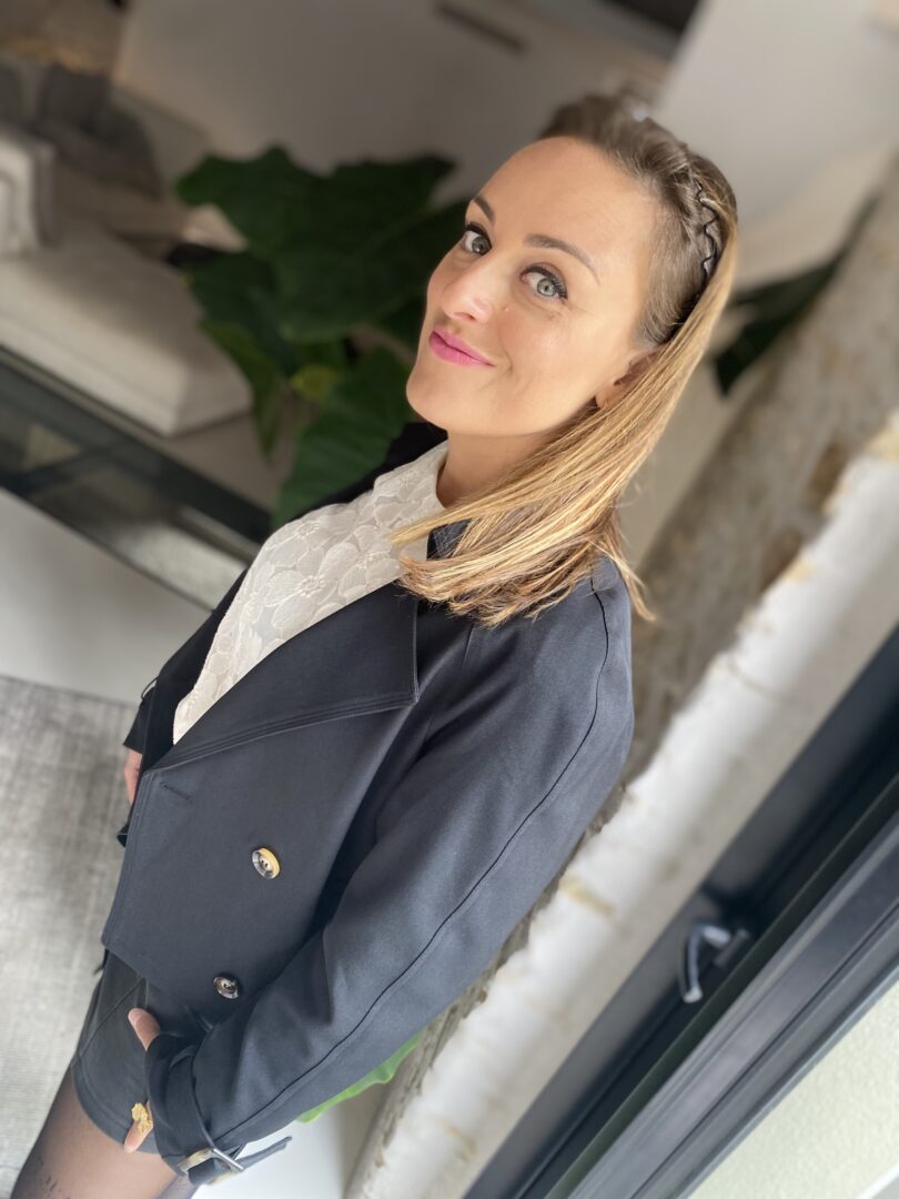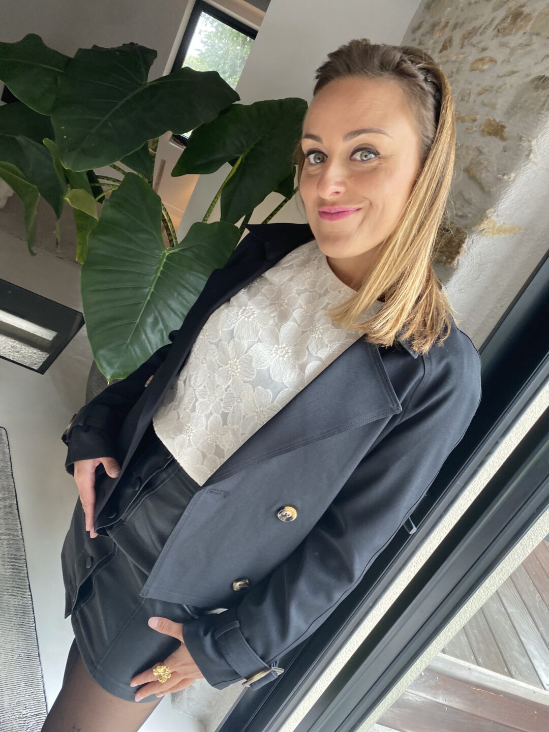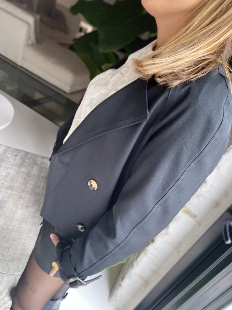 Trench court noir, manches longues. Fermeture avant croisée à boutons
